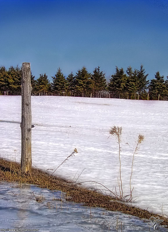Ce piquet n’affronte pas l’hiver seul. Il tient tête aux vents, au froid, aux accumulations de neige. Quelques plantes se sont asséchées à ses côtés et l’accompagne. Un groupe uni dans l’attente des températures plus clémentes et du retour à la vie autour d’eux.