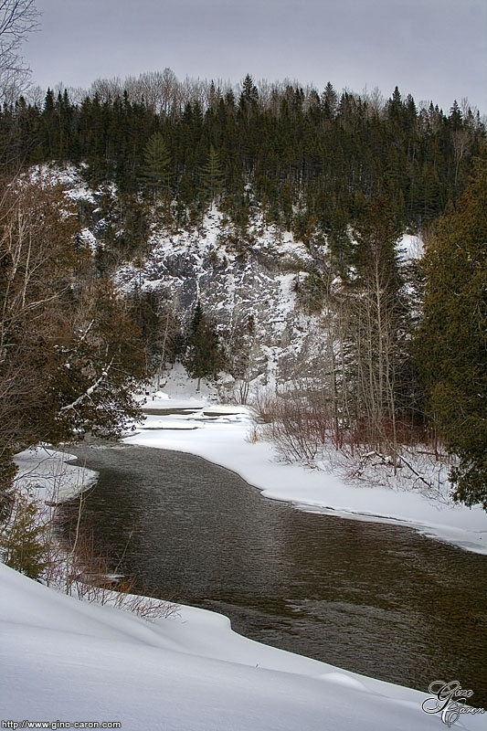 Serpentant à travers bois et rochers, la rivière émerveille par le doux son qu’elle émet durant sa descente jusqu’au fleuve. Aussi surprenant que cela puisse paraître, elle n’est pas gelée malgré les températures froides des derniers jours.