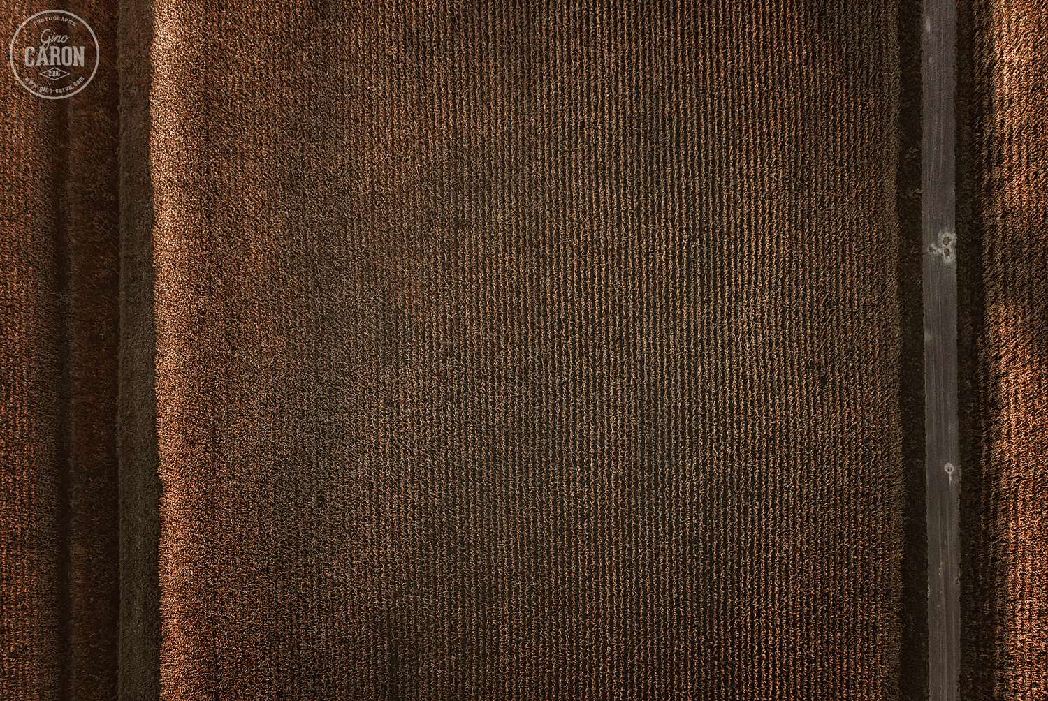 La terre se dévoile en stries brunes et dorées, un patchwork de maïs s’élevant vers le ciel. Vu d’en haut, le champ devient une mer ondoyante, un tissu de textures que les rayons du soleil caressent, révélant des ombres douces et des lumières vives. C’est un tableau vivant, un hommage à la simplicité et à la richesse de la terre, qui, sous le pinceau du vent, murmure les secrets de la croissance et de la vie.