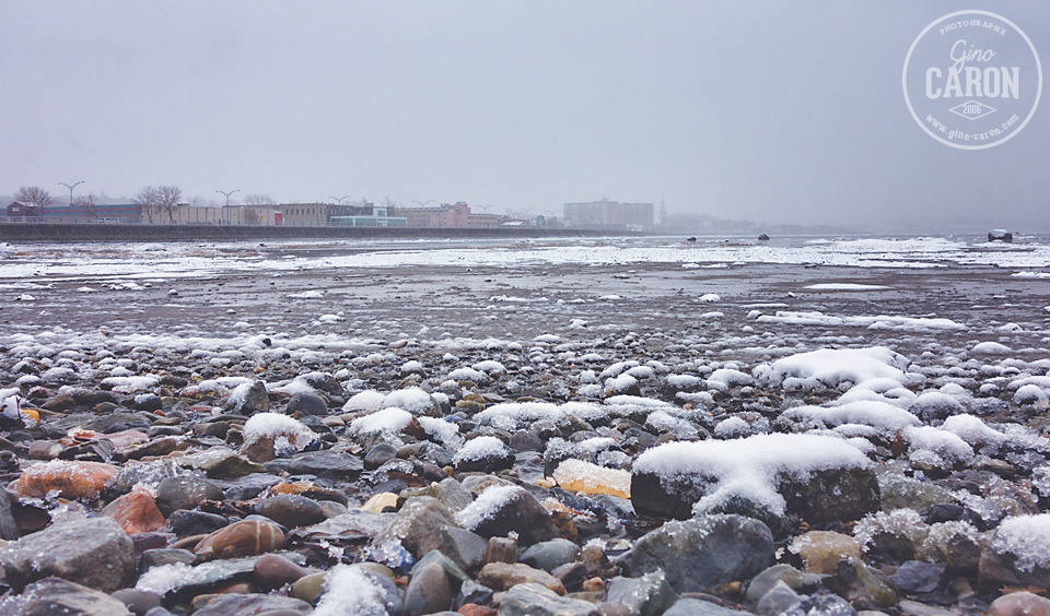 Dans cette scène automnale douce et solennelle, la neige commence à saupoudrer les galets du rivage de Rimouski, enveloppant délicatement le paysage dans une étreinte froide. L’horizon est voilé par un voile de brume neigeuse, la lumière est tamisée, les couleurs sont atténuées et la ville semble se retirer dans une attente silencieuse. Chaque pierre couverte de neige raconte une histoire de transitions, de la richesse de l’automne au sommeil de l’hiver, un monde à la croisée des saisons où le temps semble suspendu.