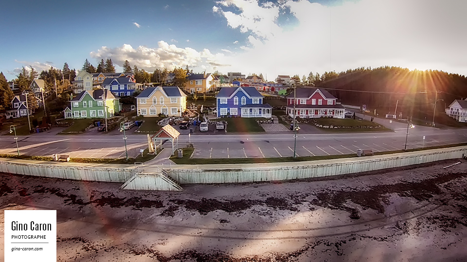 Sous un ciel majestueux, où les nuages s’amoncellent en une fresque mouvante, Rimouski se dévoile, étreinte par les eaux tranquilles du fleuve. La marée basse dénude les rives, offrant au regard les secrets habituellement engloutis. Les bâtiments, sentinelles modernes, se dressent, contrastant avec la nature environnante, tandis que la cathédrale pointe son clocher vers l’azur, rappel d’un passé ancré dans le présent.