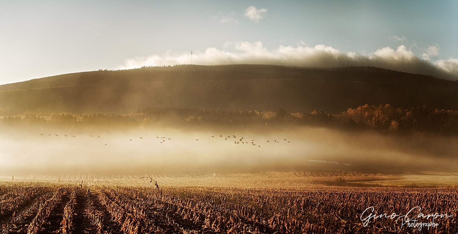 Champ de maïs fraîchement coupé, le Mont-Comi, de la brume et des oiseaux migrateurs